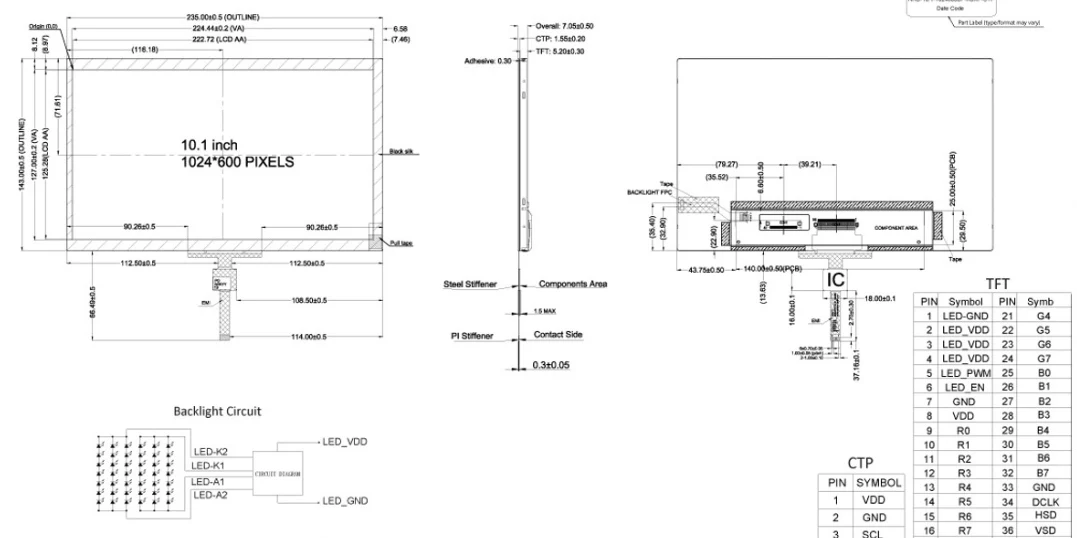 Dimensiunile sale subțiri de numai 235 mm × 143 mm × 7,05 mm îl fac potrivit pentru dispozitive compacte. Alimentat de 3,3V și folosind un cablu FFC cu 40 de pini (FFC cu 6 pini pentru CTP), modulul de ecran tactil PCAP industrial de 10,1 inchi funcționează la temperaturi cuprinse între -20°C și 70°C și are o gamă de temperatură de depozitare de la -30°C la 80°C, asigurând o funcționare fiabilă chiar și în medii dure.